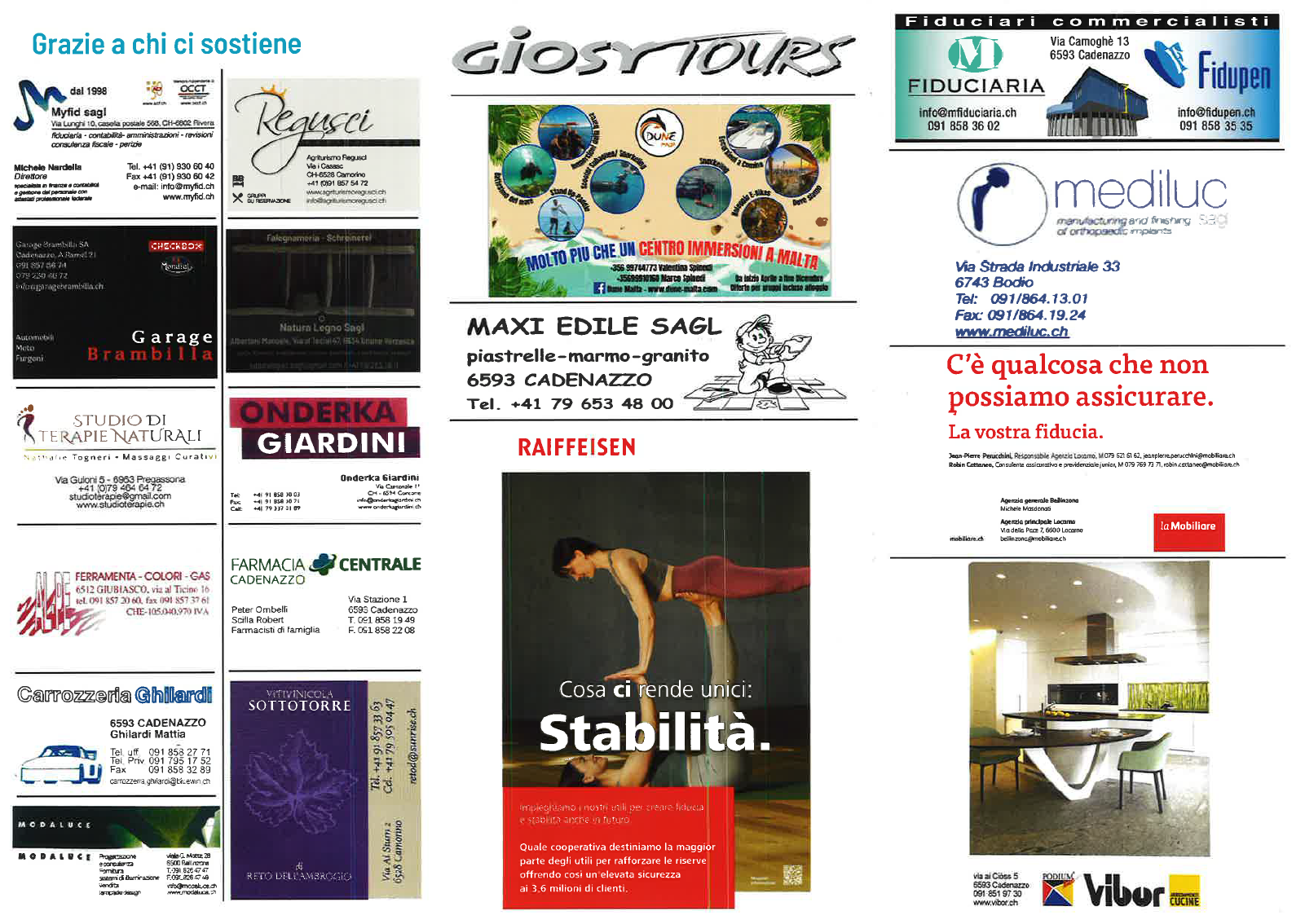 Un particolare ringraziamento va al comune di Cadenazzo, che ci sostiene da parecchi anni con un contributo finanziario e ci aiuta a contenere i costi delle nostre attività.